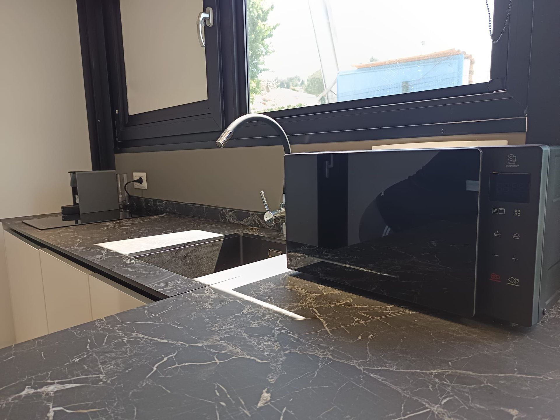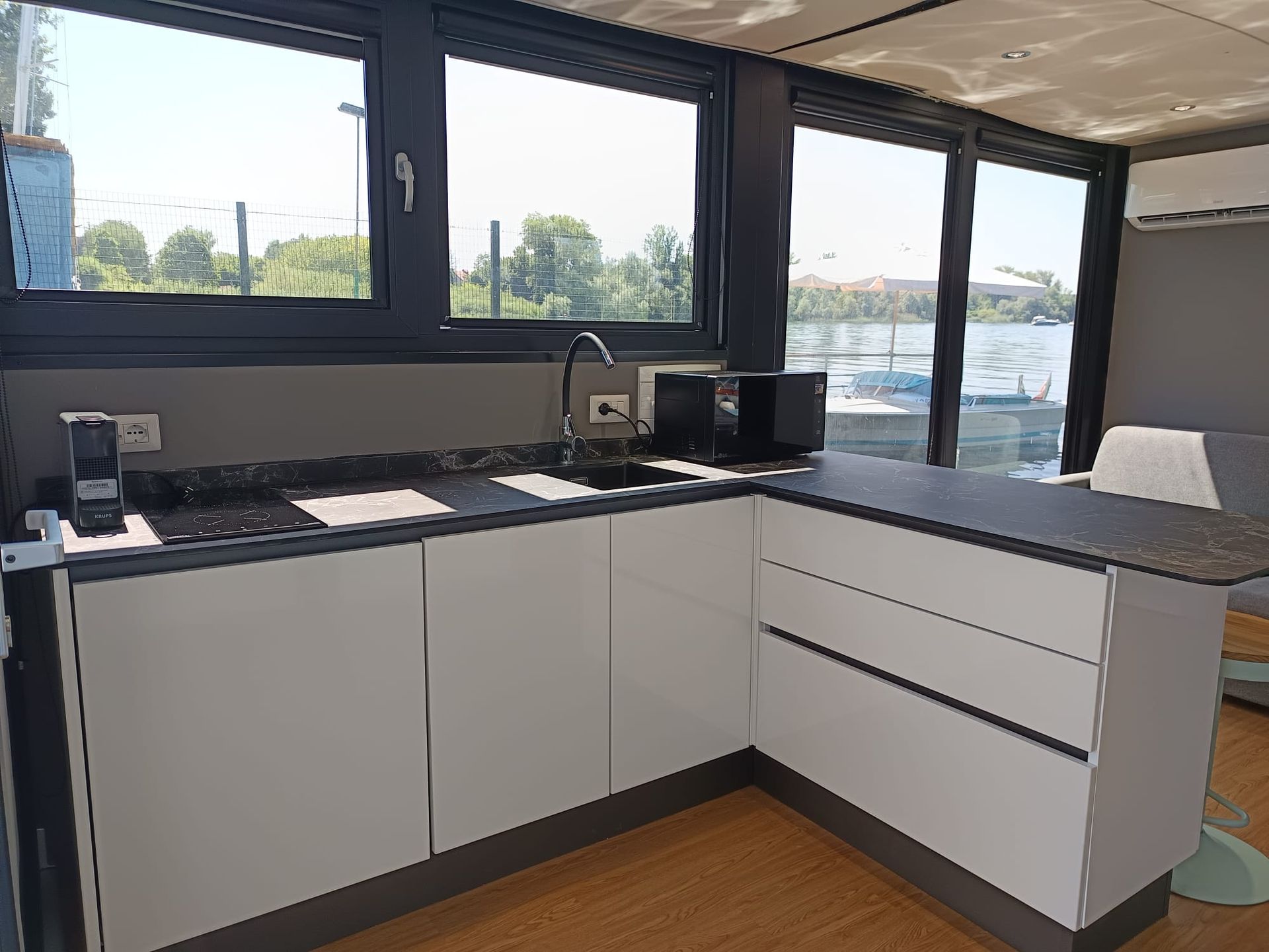• Una cucina completamente attrezzata con elettrodomestici moderni e stoviglie di alta qualità firmate Marine Business